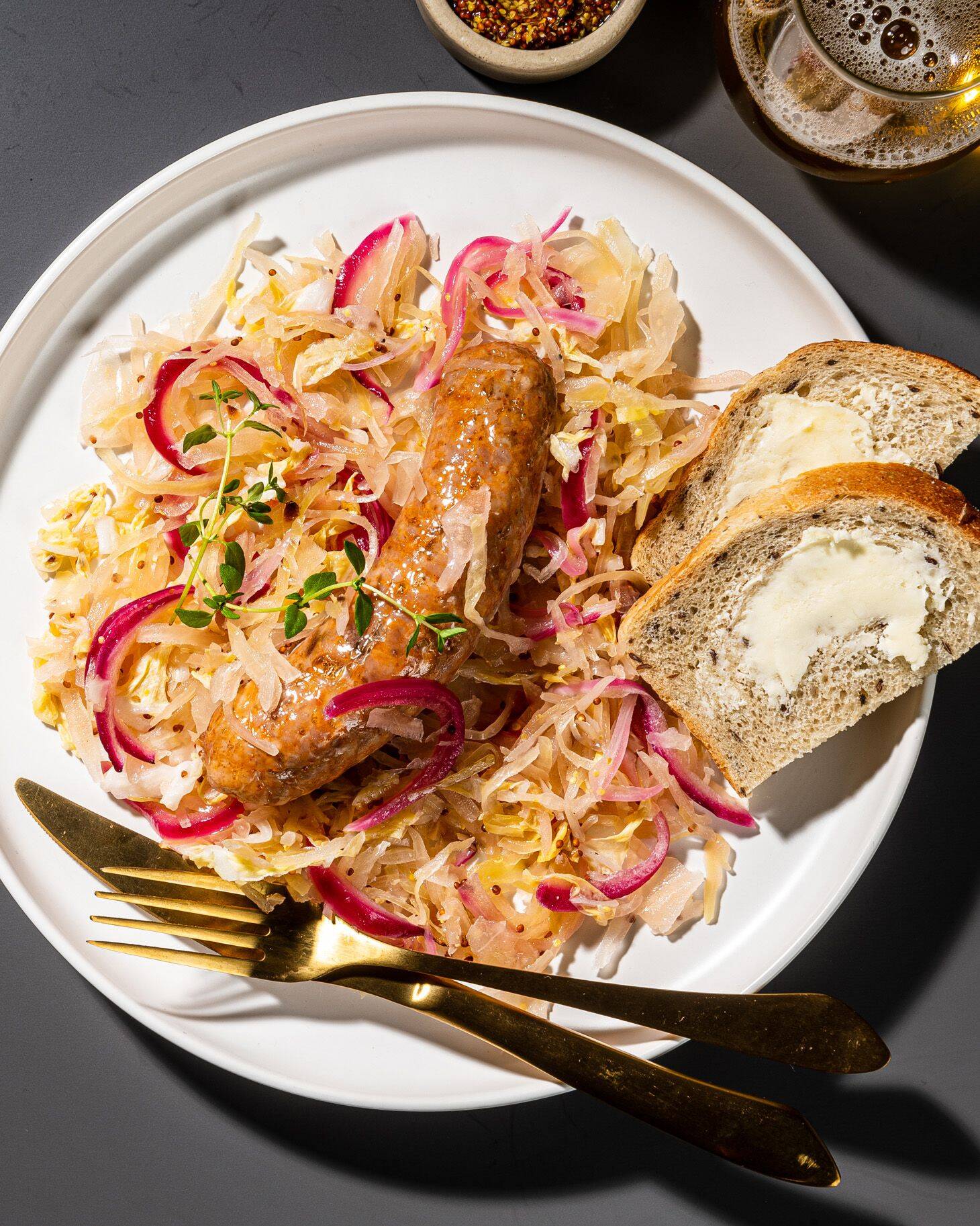 - 1 pound pork sausage, such as Polish or sweet or hot Italian (about 5; may substitute veggie sausage)