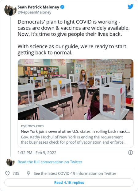 | | Rep. Sean Patrick Maloney (D-N.Y.), head of the Democratic Congressional Campaign Committee: | | | | | | Many Democratic governors are now expressing a desire for a return to normalcy. The new mantra comes as polls show Americans are "tired" and "frustrated" by the current state of the pandemic. | | This week saw a wave of examples. On Monday, five states — California, Oregon, Delaware, Connecticut and New Jersey — announced plans to lift some mask mandates. Yesterday, Rhode Island and Massachusetts said they'd end school mask mandates, while New York and Illinois focused on lifting restrictions for businesses. | - "Several of these Democratic governors have stressed that their constituents need to live with the virus, echoing rhetoric that their Republican counterparts adopted earlier in the pandemic when they declined to take statewide measures to curb the delta and omicron surges," our colleagues Fenit Nirappil and Tyler Pager write.