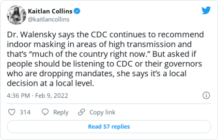| | Some states' plans to drop mandates won't go into effect for weeks, particularly in schools. But still, the governors are ahead of CDC guidance, which has repeatedly been criticized throughout the pandemic for being too slow. One official told Fenit and Tyler that the CDC should have been better prepared to avoid confusing Americans who may be receiving conflicting guidance from their governors, the White House and potentially local leaders. | - "We're, of course, taking a close look at this in real-time, and we're evaluating rates of transmission as well as rates of severe outcomes as we look at updating and reviewing our guidance," CDC Director Rochelle Walensky told reporters yesterday.